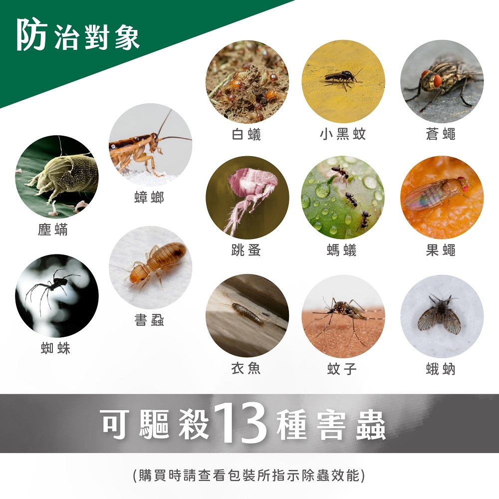 ◆ 防治對象:蚊子/跳蚤/塵蟎/蟑螂/螞蟻/蒼蠅/白蟻/小黑蚊/書蝨/衣魚/果蠅/蛾蚋/蜘蛛